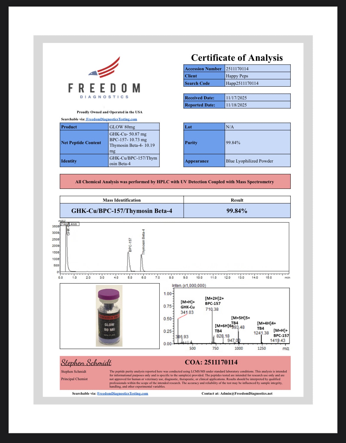 GLOW70 is a high-purity research-grade peptide formulation designed to study synergistic effects in tissue repair, skin regeneration, and inflammation modulation. This unique 70 mg blend combines three well-studied peptides: GHK-Cu, BPC-157, and TB-500, each contributing to cellular healing and collagen support mechanisms observed in pre-clinical research.